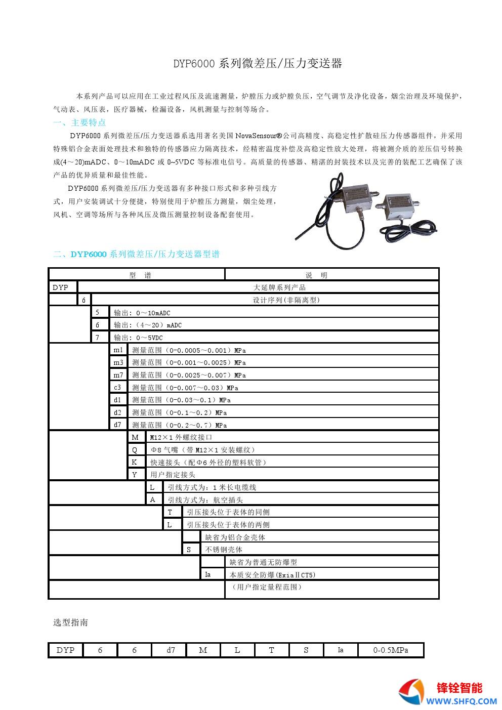 DYP6000系列微差壓/壓力變送器系選用著名美國NovaSensour®公司高精度、高穩(wěn)定性擴散硅壓力傳感器組件,并采用特殊鋁合金表面處理技術和獨特的傳感器應力隔離技術,經(jīng)精密溫度補償及高穩(wěn)定性放大處理,將被測介質(zhì)的差壓信號轉(zhuǎn)換成(4~20)mADC、0~10mADC或0~5VDC等標準電信號。高質(zhì)量的傳感器、精湛的封裝技術以及完善的裝配工藝確保了該產(chǎn)品的優(yōu)異質(zhì)量和最佳性能。
